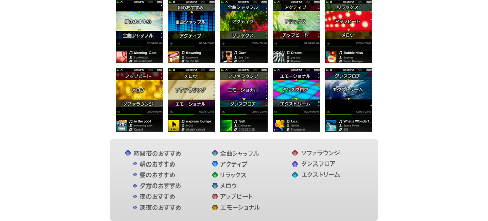 アクティブ / エモーショナル / ソファラウンジ / ダンスフロア / エクストリーム / アップビート / リラックス / メロウ / 朝のおすすめ / 昼のおすすめ / 夕方のおすすめ / 夜のおすすめ / 深夜のおすすめ / 全曲シャッフル