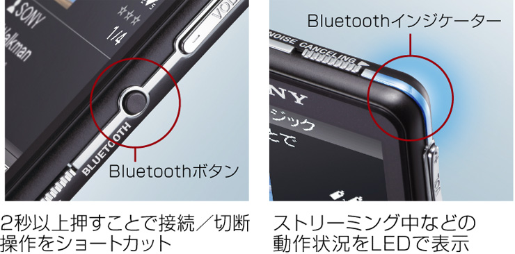 本体右側面にBluetoothボタン、上面にインジケーターを装備。ボタンを長押しすれば、あらかじめ設定(ペアリング)してある機器とすぐに接続できます。