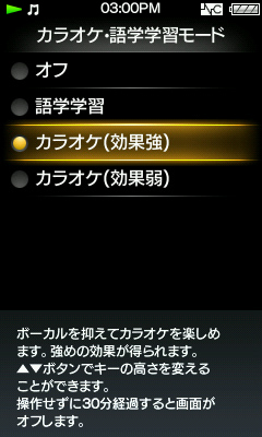 楽曲のボーカル部分を2段階の強弱で抑えることが可能。「歌詞ピタ(TM)」とあわせて使えば、“ウォークマン”にためたお気に入りの曲で手軽にカラオケを楽しめます。