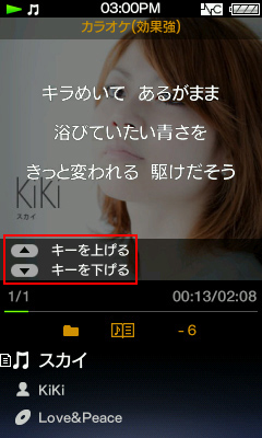 楽曲の音程を上下それぞれ6段階まで調整することが可能。カラオケマシンのように自分のキーにあわせて歌えます。