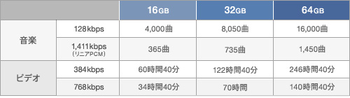 最大約42,000曲(*2)保存可能な大容量メモリーを内蔵。PCや他のデジタルミュージックプレーヤーにためた音楽・ビデオ・写真をたっぷり持ち運んで楽しめます。また、CDと同じ高音質のリニアPCM形式で、アルバム約100枚分(*3)の楽曲を携帯できます。
