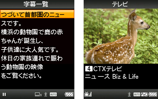 ワンセグ放送の字幕や番組情報の表示に対応。表示切り換えが可能
