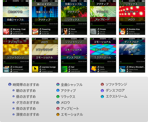 ソニー独自の12音解析技術により、ウォークマンのミュージックライブラリにためた楽曲を10チャンネルに自動分類。チャンネルを選ぶだけで、そのときの気分やシーンにあった楽曲を楽しめます。