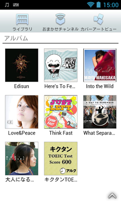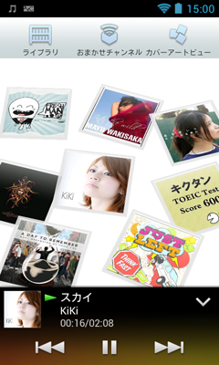 アルバム名やアーティスト名順に表示されるジャケット写真を指でタッチすれば、選んだアルバム単位で選曲できます。