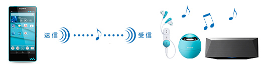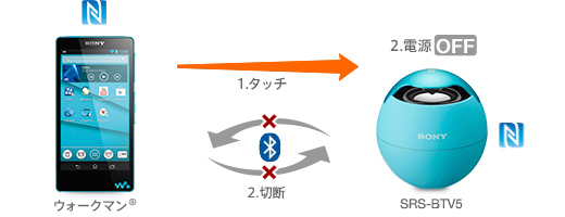 ウォークマンをNFC搭載のヘッドホンやスピーカーなどにタッチすると接続機器の電源がONになり、Bluetooth接続が完了します。