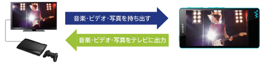 PlayStation(R)3 のHDD に貯めた音楽・ビデオ・写真をウォークマンへ転送して再生できます(*)。また、ウォークマンに保存してある音楽・ビデオ・写真を、PlayStation(R)3 経由でテレビに出力して大画面で楽しめます。