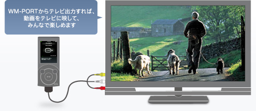 映像/音声出力ケーブルWMC-NWV10(別売)でテレビと接続。“ウォークマン”にためたビデオをテレビ出力すれば、テレビに映してみんなで楽しめます。