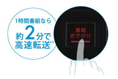 *3 録画モード「QVGA384k」で記録した1時間番組を高速転送した場合。録画した映像データの転送速度は、接続環境や動作状況により異なります。高速転送は転送時の転送リストに「高速マーク」がある場合のみです(録画時の本体の設定などによっては高速転送できない場合があります。その場合は等倍速での転送となります)『録画2』で録画した番組は「おでかけ転送用動画ファイル」の同時記録が行われないため、「おでかけ転送」は等倍速となります。録画した後に「おでかけ転送用動画ファイル」の変換を行うと、転送時に高速転送が可能です