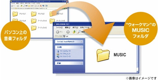 音楽管理・転送ソフトウェア「SonicStage V」を付属。アルバムジャケット/アーティスト名/ジャンルなど、さまざまな表示が可能なのでPCでの楽曲管理や検索が手軽です。“ウォークマン”への転送も直感的な操作で行えます。