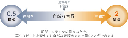 再生スピードを9段階(0.5倍-2倍速)で調整可能。デジタル処理によりスピードを変えても自然な音程で再生できるので、自分に合った速さで聴けます。