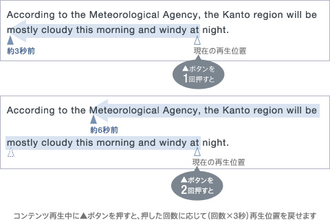 再生中に▲ボタンを押すと、約3秒再生位置を戻せます。再生スピードコントロール、A-Bリピートとの併用も可能で、効果的な学習をサポートします。