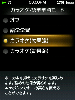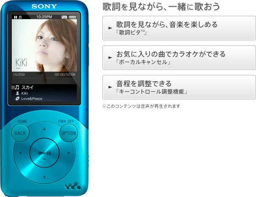 楽曲のボーカル部分を2段階の強弱で抑えることが可能。「歌詞ピタ(TM)」とあわせて使えば、“ウォークマン”にためたお気に入りの曲で手軽にカラオケを楽しめます。