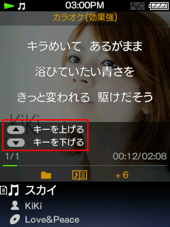 楽曲の音程を上下それぞれ6段階まで調整することが可能。カラオケマシンのように自分のキーにあわせて歌えます。