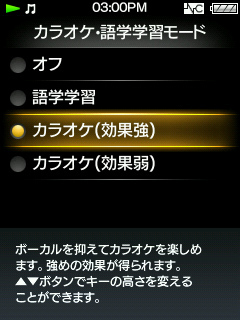 楽曲のボーカル部分を2段階の強弱で抑えることが可能。「歌詞ピタ(TM)」とあわせて使えば、“ウォークマン”にためたお気に入りの曲で手軽にカラオケを楽しめます。