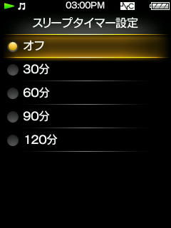 スリープタイマー機能を搭載。設定した時間が経過すると自動的に再生が停止するので、お気に入りの曲を聴きながら眠りたいときなどに便利です。タイマーは30分単位で120分まで設定できます。