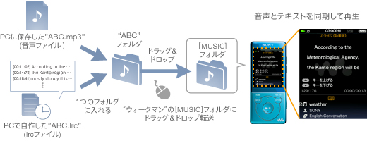 lrcファイルに対応しているので、自分で作成したlrcファイルを使って、“ウォークマン”画面上で音声とテキストを同期して再生可能。例えば、語学コンテンツに合わせたファイルを作成すれば、語学をスマートに学べます。操作は、lrcファイルを作成し、作成したlrcファイルと音声ファイルを“ウォークマン”のMusicフォルダにドラッグ&ドロップ転送するだけ。