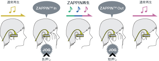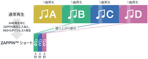 「ZAPPIN(TM)」とは曲の盛り上がり部分だけをダイジェスト再生する機能。1曲1曲、曲送りなどの操作をしなくても次々にダイジェストで聴けるので、検索などに便利です。ジョグダイヤルを長く押すことで、通常操作からZAPPIN再生に入ります。ZAPPIN再生で聴きたい曲を見つけてジョグダイヤルを軽くワンプッシュすれば、聴きたい曲の最初から再生して聴くことができます。「ZAPPIN(TM)」中のダイジェスト再生時間は4秒と15秒の2つから選べます。