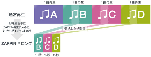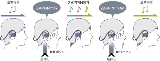 曲の盛り上がり部分を次々にダイジェスト再生する機能「ZAPPIN(TM)」。カウントダウン番組のように盛り上がり部分を次々に楽しんだり、曲送り/戻しボタンで操作することなく曲を検索することができます。ZAPPIN再生への切り替えへは音楽再生中に再生ボタンを長押しするだけ。ZAPPIN再生中に再生ボタンを軽く押せば、再生中の曲を最初から再生できます。「ZAPPIN(TM)」のダイジェスト再生時間は4秒と15秒の2つから選べます。