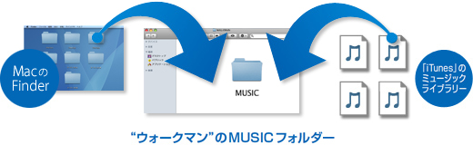 ドラッグ&ドロップによる転送に対応。今回新たにWindows OSに加えて、Mac OSに対応し、PC上の音楽データフォルダから、“ウォークマン”の「MUSICフォルダ」へドラッグ&ドロップするだけで、転送が完了します。また、iTunesのミュージックライブラリ画面で曲名を選んでドラッグ&ドロップ転送することもできます。