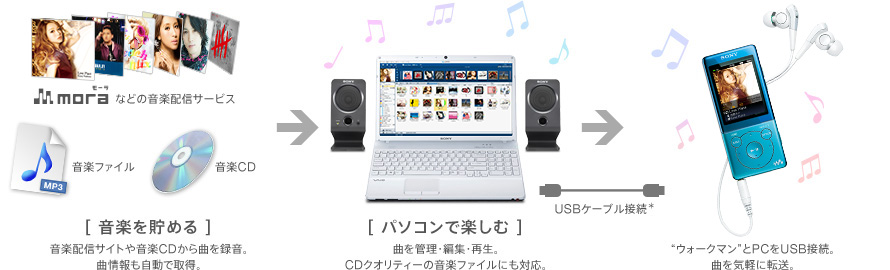 音楽や動画、写真、ポッドキャストを一括管理して、“ウォークマン”へ「x-アプリ」は多彩な音楽ファイルに対応。音楽CDから楽曲を取りこんだり、音楽ダウンロードサイト「mora(モーラ)」から楽曲をダウンロードできます。PCでの楽曲管理・再生から“ウォークマン”への転送までを手軽に行えます。