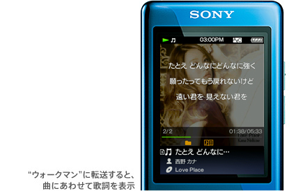 歌詞データをダウンロードして、“ウォークマン”に転送音楽CDや音楽配信サイトから購入した楽曲など、「x-アプリ」に貯めた曲に歌詞をつけることができます。「x-アプリ」上で好みの曲を選んで、歌詞データ*1をダウンロード。曲と一緒に“ウォークマン” *2へ転送すれば、曲の再生にあわせて歌詞が表示されます。