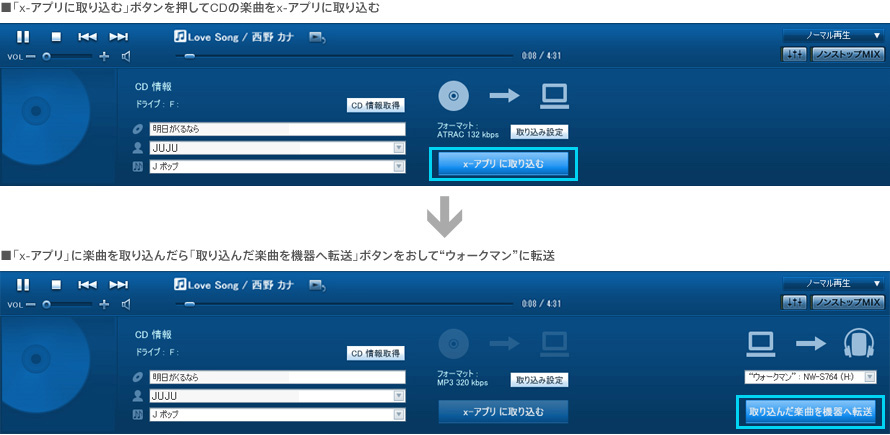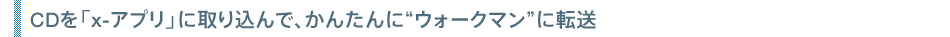 “ウォークマン”から「x-アプリ」へワンクリック転送“MDウォークマン”や“CDウォークマン”から直接“ウォークマン”に録音した楽曲を、ワンクリックで「x-アプリ」に転送できます。