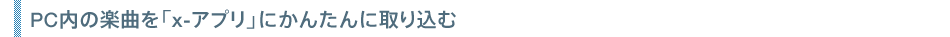 iTunesなど他のアプリで管理している曲や、PC内にある楽曲を「x-アプリ」に簡単に取り込めます。「x-アプリ」起動時に指定したPC内のフォルダを確認し新規追加されたコンテンツがある場合には、自動的に取り込むように設定することも可能です。