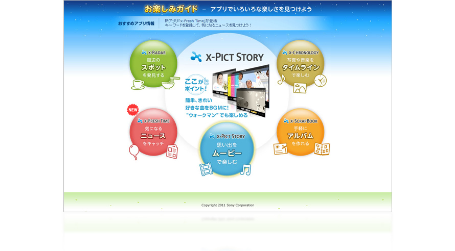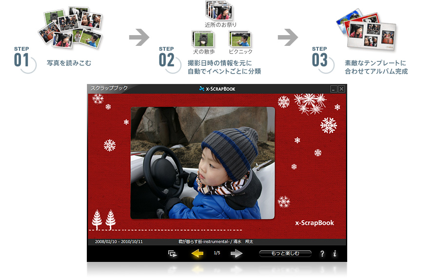 「x-アプリ」に取りこんだ写真と楽曲で、BGM(楽曲)付きのフォトアルバム(スクラップブック)を作れます。写真は撮影日時などで自動的に分類されるので、イベントごとにまとまった思い出のアルバムとして楽しめます。選択できるテンプレートは随時追加されていきます。また、作成したコンテンツは“ウォークマン”に転送して楽しむこともできます。