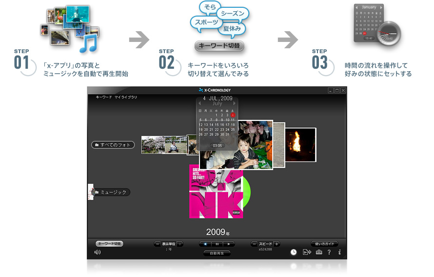 「x-アプリ」に取りこんだ写真と楽曲を、撮影日時やアルバムがリリースされた年などにあわせて再生。音楽と一緒に、時間軸にそって流れるようなビジュアルが楽しめる「体験型アプリケーション」です。
