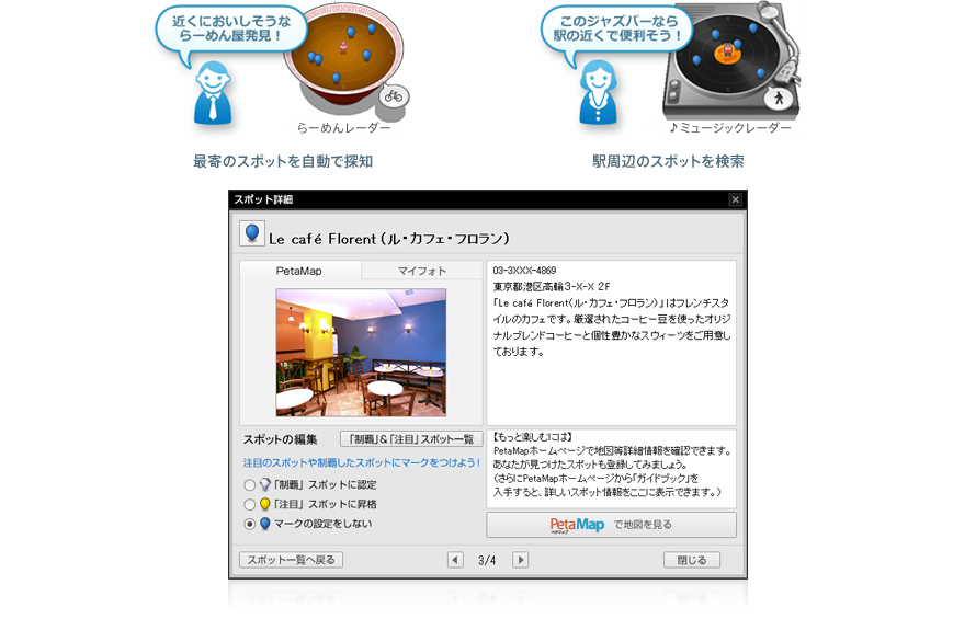 「x-Radar」(エックス・レーダー)は、多彩なレーダーで現在地や指定した駅周辺の楽しいスポットを探知することができる「体験型アプリケーション」です。音楽を楽しめるお店、人気のレストラン、写真撮影におすすめの場所など、今まで気づかなかった新しいスポットを発見したり、話題のスポットをチェックすることができます。また、お気に入りのスポットには、「x-アプリ」に取り込んだフォトを登録して、自分だけの思い出の場所としてお楽しみいただくこともできます。