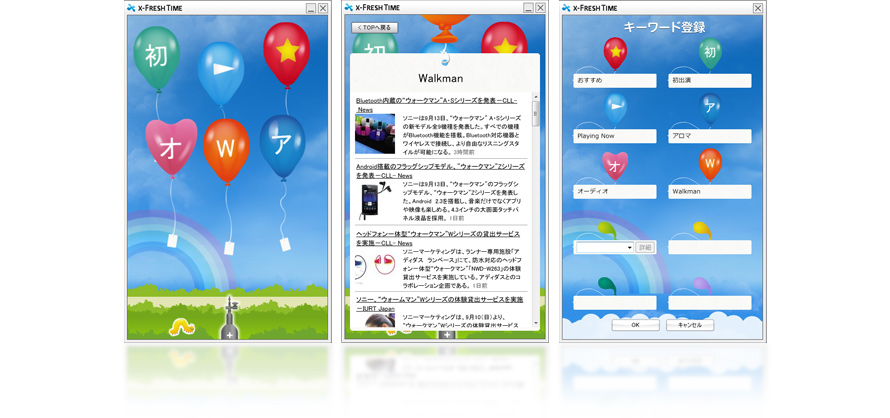 キーワードに対応したおすすめ情報をwebから取得する、情報収集アプリケーションです。キーワードは自分で設定できるほか、「x-アプリ」と連動して 「再生中楽曲のアーティストに関する情報(“Playing Now”)」や「ライブラリに含まれるアーティストの情報(おすすめ)」を自動的に収集することが出来ます。