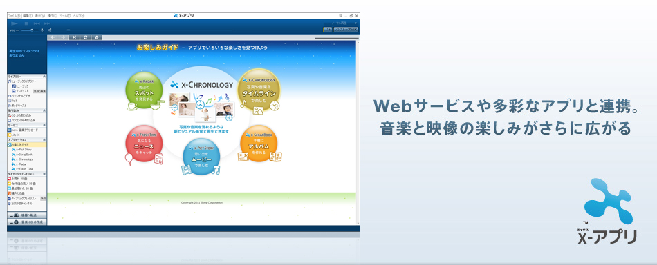 「x-アプリ」に搭載のアプリケーションで音楽と映像をもっと楽しむ「x-アプリ」に搭載されているアプリケーションの、「どのような機能なのか?どのように楽しめるのか?」を把握しやすくするポータル画面です。この画面から、各種アプリケーションを起動することもできます。