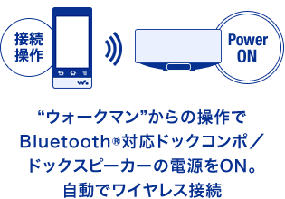 ドックコンポ/ドックスピーカーの電源が入っていなくてもBluetooth®スタンバイモード*2にしておけば、“ウォークマン”からの接続操作で電源ON。スムーズにワイヤレス接続できます。わざわざドックコンポ/ドックスピーカーのところまで行かなくても、家に帰ってきてすぐに“ウォークマン”の音楽をワイヤレスで楽しめます。