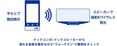 “ウォークマン”の音楽をドックコンポ/ドックスピーカーで聴きながら、手もとの“ウォークマン”で歌詞・写真・インターネット*2などを楽しんだり、楽曲を検索したりできます。ドックコンポ/ドックスピーカーにセットすることなく、手もとで“ウォークマン”を操作できるので自由度がさらにひろがります。