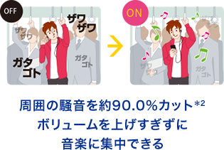 ノイズキャンセリング機能を搭載しているので、Bluetooth®ヘッドホン*1使用時でも周囲の騒音を約90.0%カット*2。大好きな音楽を、クリアないい音で快適に楽しめます。