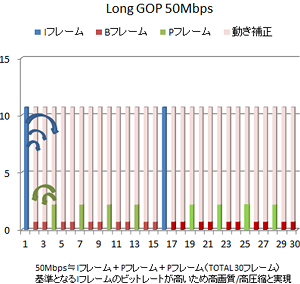 XDCAM HD422コーデックはMPEG-2 Long GOP方式を採用し、フレーム間の差分情報を用いることで高効率の圧縮を実現したため、低ビットレート(=高圧縮)でありながら「高画質」「長時間記録」が特長です。