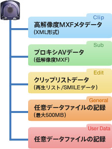 XDCAM は高解像度MXFファイルを記録するClipフォルダ、低解像度ProxyAVデータ用のSubフォルダ、ClipListデータを保存するEditフォルダの他、任意のデータを記録するGeneralフォルダとUserDataフォルダから構成されています。XAVCファイルやMP4ファイル、MA用のBWFなど音声ファイル、ノンリニア編集機のネイティブファイル、取材情報のWordファイル、JPEG Still 画像等XDCAMフォーマット以外のファイルはUserDataフォルダに"データ"として保存することも可能です。