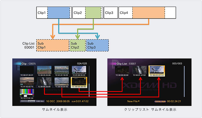クリップリストは、ディスクやメモリに記録されているクリップから必要な素材を選び、カット編集を行う機能です。クリップリストデータは素材をどのクリップの、どのタイムコードからどのタイムコードまでを再生するかというプレイリストのようなもので、"サブクリップ"と呼ばれています。このクリップリストは、ソフトウェア"Content Browser"で作成したり、XDCAM HD・XDCAM