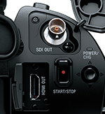 3G対応のSDI出力を搭載し、本体記録モードと同じフォーマットで外部出力することが可能です。HDMIの場合もプログレッシブ信号をプルダウンすることなくネイティブで出力でき、タイムコードやRECトリガーが重畳されているので、外部レコーダーを用いる場合にも便利です。