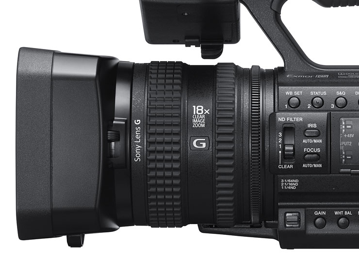非球面レンズやED(特殊低分散)ガラスを採用することにより高画質を実現した、広角29.0mm(35mm換算)・光学12倍のソニーGレンズを搭載。全画素超解像ズーム機能で18倍(4K)、24倍(HD)ズーム、さらにデジタルエクステンダー機能で最大48倍の高倍率ズームを実現します。またフォーカス・ズーム・アイリスの3つのリングを装備し、マニュアル操作時の操作性を高めています。
