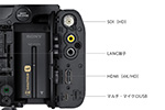 バッテリービデオライト「HVL-LBPC」[別売]とワイヤレスマイクロホンパッケージUWP-D21(*)/UWP-D22(*)[別売]に対応したマルチインターフェース(MI)シューを搭載しています。カメラ本体からビデオライトの点灯ON/OFF制御や、ワイヤレスレシーバーへの電源供給、ケーブルレスでの音声信号入力が可能です。