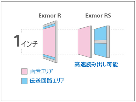 1.0インチ大型センサーの採用による高感度・低ノイズ特性に加えて、従来は画素領域の横に配置されていた伝送回路をセンサーの背面に配置する「積層型構造」の採用により伝送回路を大型化。センサーからの高速読み出しを可能とすることによりHFR撮影機能や動体歪みの少ない撮影を実現しました。