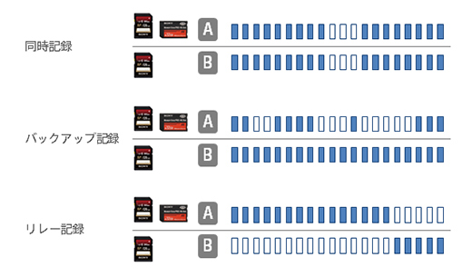 2つのメモリーカードスロットを搭載し、2枚のメモリーカードを同時にREC ON/OFFしたり、片方のメモリーカードはREC ON/OFFしながら、もう一方のメモリーカードはREC ON状態を継続するなど、充実したバックアップ記録機能を持ちます。また、AスロットのメモリーカードからBスロットのメモリーカードへ連続記録ができるリレー記録機能も搭載し、長時間記録にも対応しています。