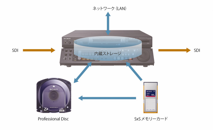 その他、内蔵ストレージ・Professional Disc・SxSメモリーカードのメディア間素材コピーを行うことも可能です。