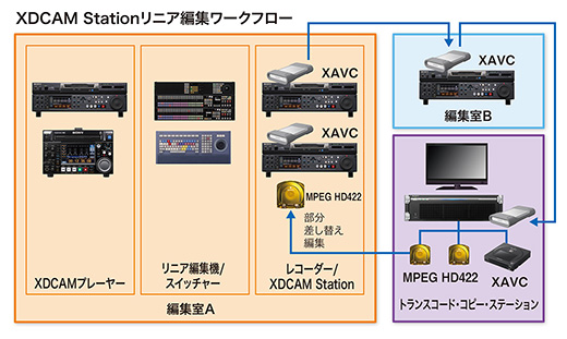 XDCAM Stationにリニア編集オプション(XDBK-104またはXDBK-105)を装着することで、従来のテープと同様のビデオ/オーディオインサート編集やアセンブル編集、プリリード編集などを行うことができます。