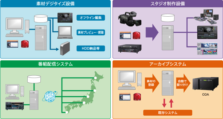 Media Backbone Ensembleは、「ファイルベース」「ワークフロー」をキーワードに、コンテンツを扱うお客様のスマートな業務を実現するためのソフトウェアエンジンです。お客様の困っていることを分析し、「収録」〜「編集」〜「送出」〜「アーカイブ」といった一連の業務のための様々なパーツをあわせて開発し、システムとしてご提供させていただきます。
