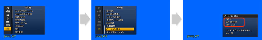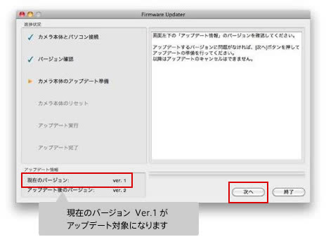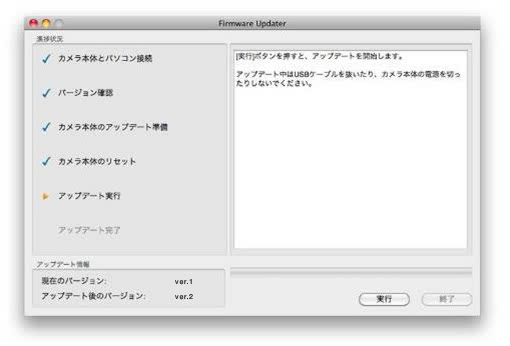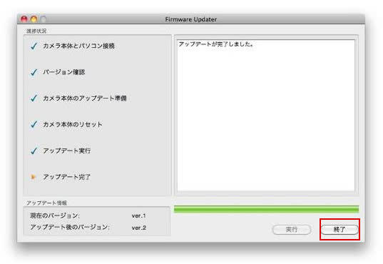 注意: アップデート完了後は、カメラ本体の電源を切って電源を入れなおしてください。