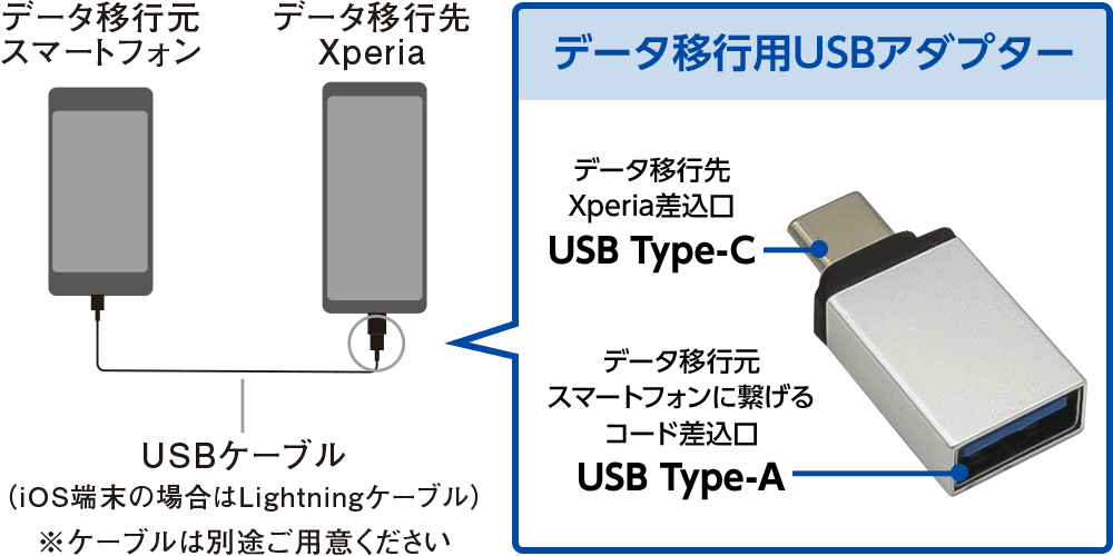 データ移行元のスマートフォンと、データ移行先の新しいXperiaをケーブルでつなぐためのアダプターです。