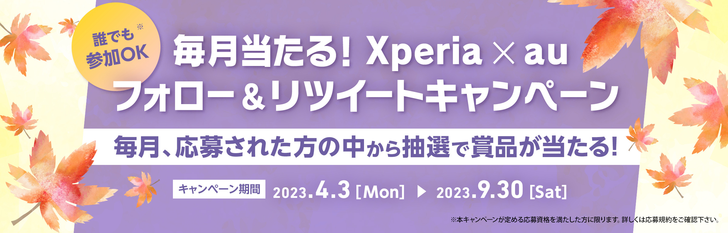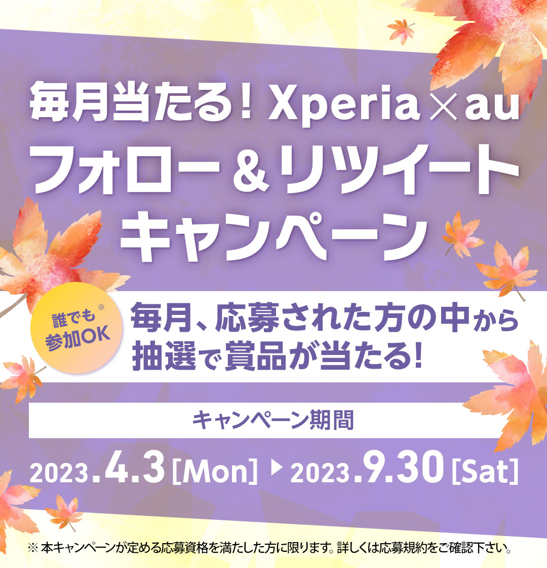 - 本キャンペーン(毎月当たる!Xperia×au フォロー&リポストキャンペーン)はソニーマーケティング株式会社により実施されています。 本キャンペーン(毎月当たる!Xperia×au フォロー&リポストキャンペーン)についてのお問い合わせは株式会社クオカードではお受け出来ません。