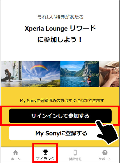 メニューのマイランクをタップして、遷移先でMy Sony(取得無料)にサインインして、Xperia Lounge リワードに参加します。